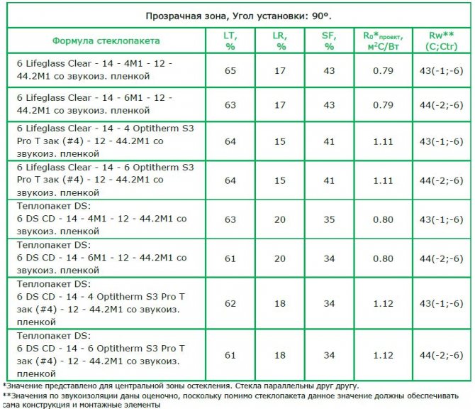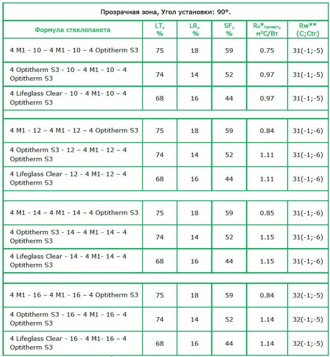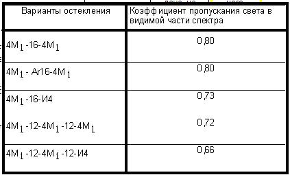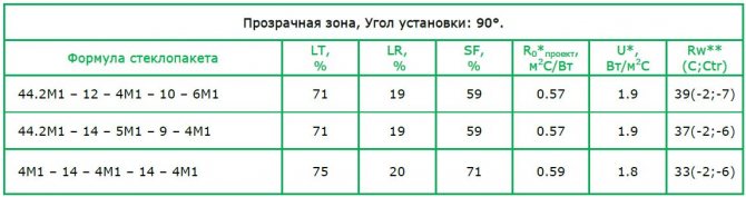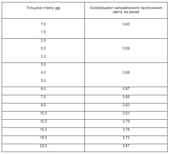 Le tableau comparatif montre quelle transmission lumineuse GOST est définie pour chaque type de vitrage.