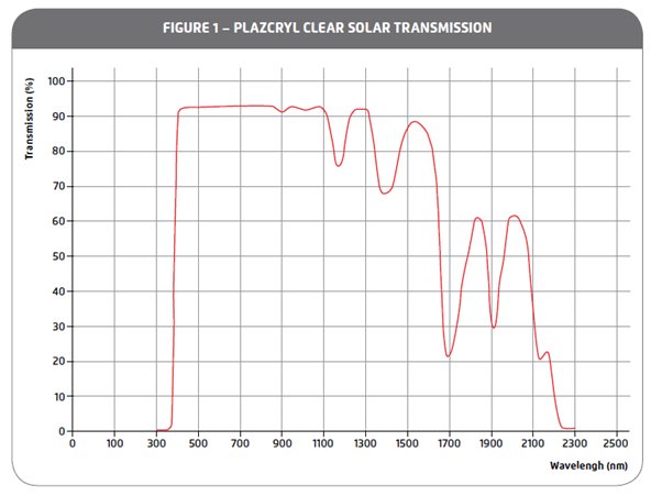 La longueur d'onde du spectre de la lumière du soleil qui atteint la surface de la Terre varie de 250 nm à 2500 nm. Ce spectre peut être divisé en trois parties selon l'augmentation de la longueur d'onde. Rayonnement ultraviolet (UV) inférieur à 400 nm, plage visible entre 400 et 700 nm et rayonnement infrarouge (IR) supérieur à 700 nm. Les plaques transparentes PLAZCRIL bloquent partiellement les UV et transmettent la lumière visible et le rayonnement IR.