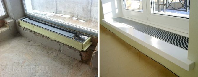 Avant d'acheter un convecteur, vous devez réfléchir aux options pour faire sauter les fenêtres, et pour cela, vous devez comprendre ce qui interfère avec cela.Souvent, la raison est la grande verrière du rebord de la fenêtre au-dessus du radiateur. Dans ce cas, une modernisation peut être effectuée: depuis la rue, plusieurs trous sont réalisés avec un long foret sur presque toute la largeur du rebord de la fenêtre.