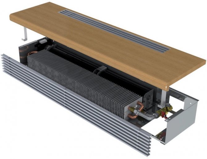 Les convecteurs intégrés, selon le caloporteur utilisé, sont divisés en eau et électrique. Vous devez penser à l'installation du premier au stade de la construction ou de la réparation, car les niches pour l'installation de convecteurs doivent être préparées avant l'installation du sol, ainsi que les communications établies et connectées. L'installation d'appareils électriques est moins problématique, mais leur entretien est plus coûteux.