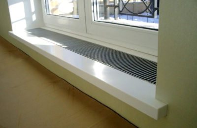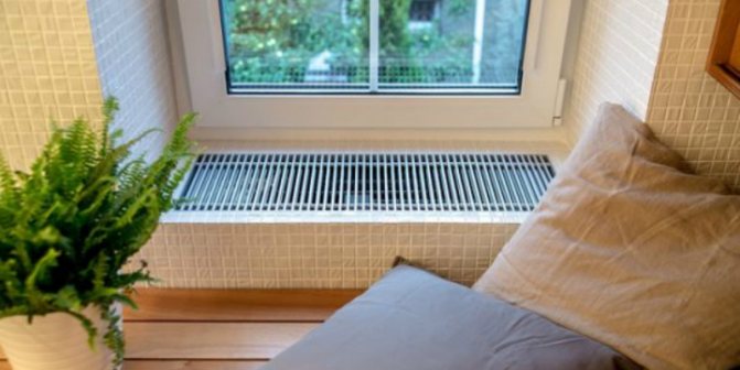 Le convecteur dans le rebord de la fenêtre est un appareil avec un indicateur de rendement élevé. Le plus souvent, la convection forcée est utilisée ici, fournie par des ventilateurs tangentiels. Ces ventilateurs sont construits sur la base de moteurs électriques à faible bruit, ils ne créeront donc pas d'inconfort la nuit. Mais ils assurent une lutte efficace contre la condensation et luttent contre le froid provenant du vitrage.