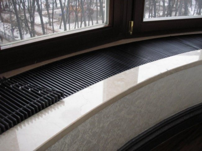 Ainsi, le corps lui-même est situé directement sous la fenêtre. Il y a des tubes dans le boîtier, à l'intérieur desquels le liquide de refroidissement s'écoule. L'air chaud sort par une grille spéciale et est ensuite placé dans le rebord de la fenêtre lui-même. La chaleur agit alors sur le verre, éliminant la condensation. Ainsi, la fenêtre sera toujours sèche, quelle que soit la météo extérieure.