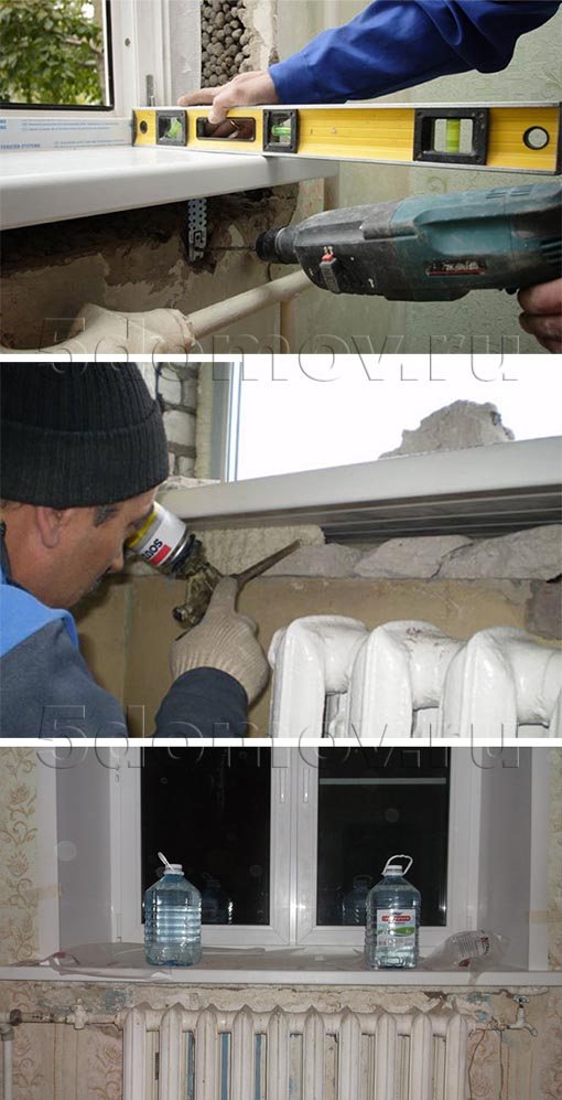 Après avoir ajusté le rebord de la fenêtre, il est mis à niveau et fixé. Le vide qui se forme sous le fond doit être rempli de mousse en plaçant plusieurs poids à la surface (bidons d'eau, briques). Dans cette position, le produit est laissé jusqu'au lendemain.