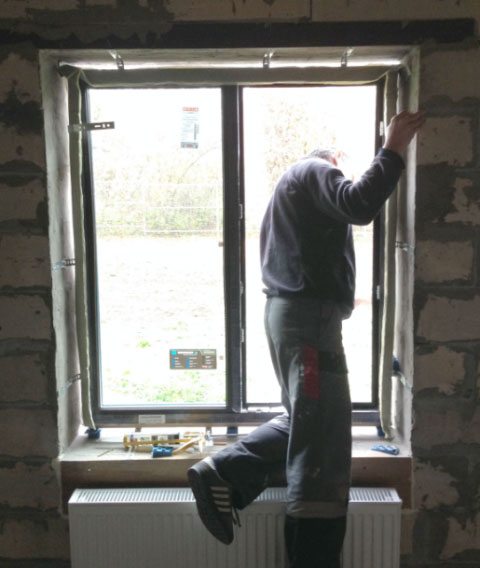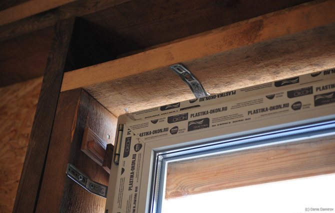 Lors de l'installation de la boîte dans l'ouverture par le haut, il doit y avoir un espace de 3 cm entre la boîte et l'ouverture. L'espace entre la boîte et le mur est scellé avec une isolation en jute et fermé avec un boîtier des deux côtés. Il est préférable d'utiliser les marées noires dans les maisons en bois et les appuis de fenêtre peuvent être en bois ou en polymère. Si un rebord de fenêtre en bois doit être installé, fixez-le d'abord, puis installez le cadre de sorte que le profil inférieur repose avec tout son plan sur le rebord de fenêtre en bois. L'espace entre le cadre et la boîte en bois est expansé avec de la mousse de polyuréthane qui, à la suite de la polymérisation, forme une couche isolante qui sert également de fixation supplémentaire du cadre. Pour que la mousse ne perde pas ses propriétés, elle doit être isolée, par exemple, avec du plâtre. Les articulations commencent à mousser de bas en haut. Il est recommandé de mousser les joints d'une largeur maximale de 4 cm.