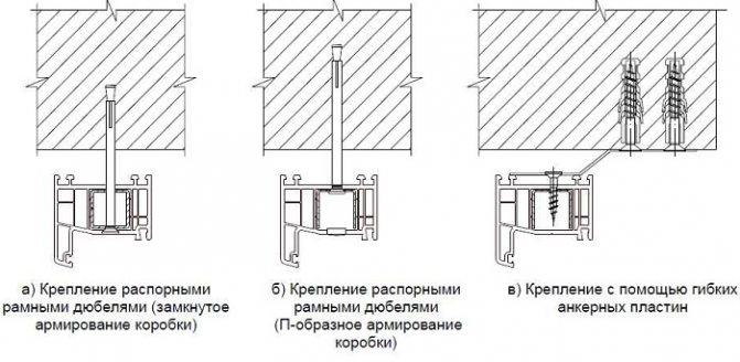 Le plus souvent, les installateurs combinent le type de fixations: les parois latérales des sections borgnes peuvent être fixées en toute sécurité à travers le profilé à des vis autotaraudeuses (une cheville de 6 mm et une rondelle de presse d'une longueur appropriée), des sections avec des châssis ouvrants - un ancrage de 10 mm. Haut / bas - soit des plaques, soit pas de fixations du tout, uniquement de la mousse et des entretoises.