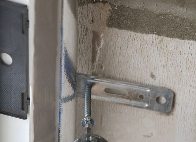 Veuillez noter que la plaque d'ancrage est fixée au mur, pas à la pente de plâtrage et doit être située sous les bandes d'étanchéité utilisées lors de l'installation !!!