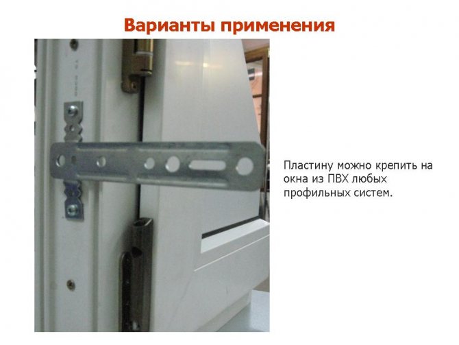 La plaque d'ancrage est fixée d'un côté à la partie extérieure du cadre de la fenêtre, l'autre côté est fixé dans l'ouverture avec des ancrages ou des vis autotaraudeuses. Il y a des plaques qui sont maintenues sur le cadre par des saillies dentelées ou qui s'enclenchent dans un quart du profil. Certains installateurs ne fixent même pas de telles plaques.