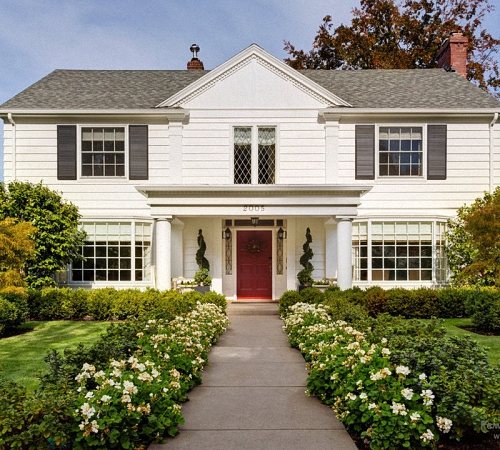 La première consiste à planter les plantes et leur disposition dans un certain ordre des deux côtés de la même manière. Ce principe est assez simple et traditionnel. Il convient aux maisons de structure symétrique, dans lesquelles l'entrée est située au centre et où il y a le même nombre de fenêtres des deux côtés.