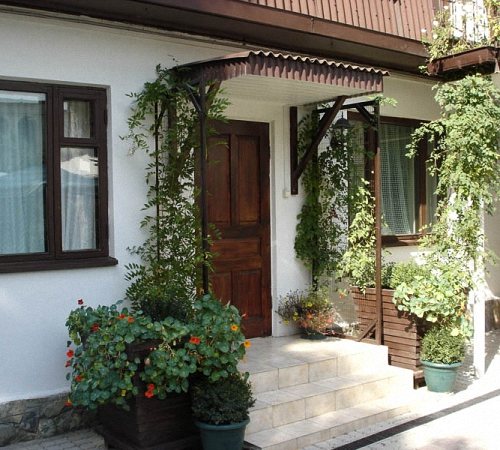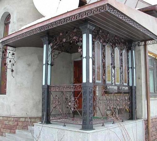 Pour protéger le porche des effets des précipitations, un auvent est réalisé sur son territoire. Les garde-corps agissent à la fois comme un élément décoratif et remplissent leurs principales fonctions.