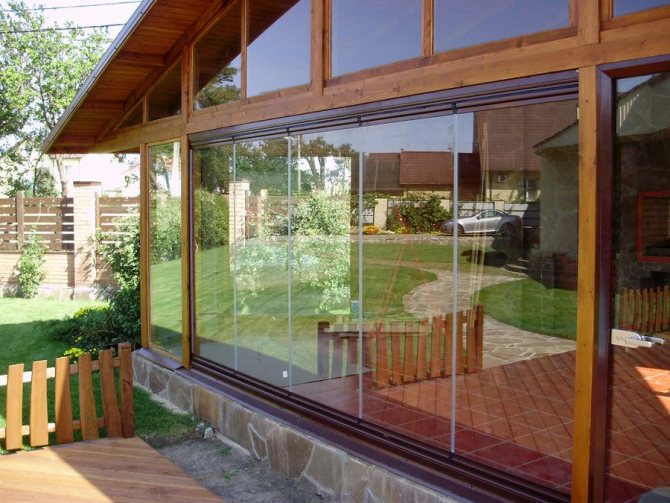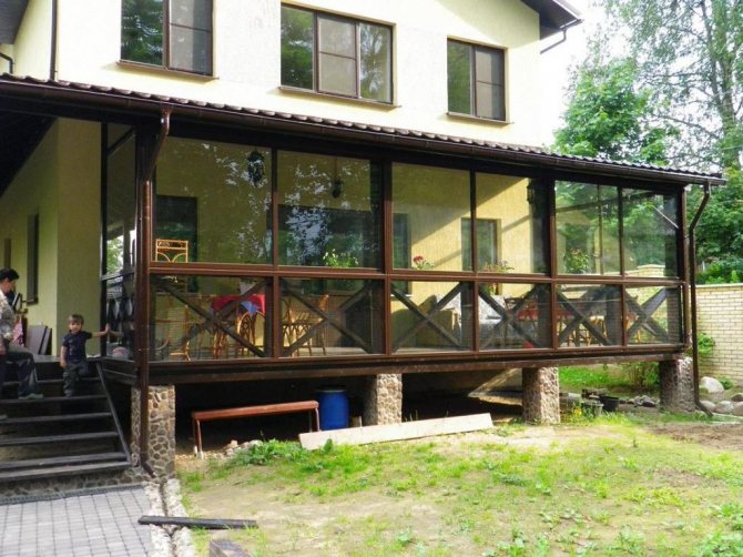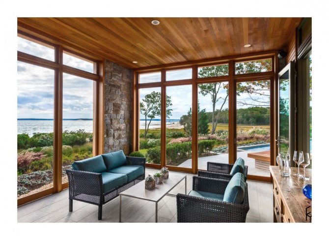 Le vitrage du porche-terrasse d'une maison de campagne avec des fenêtres panoramiques élargira la surface utilisable. Ici, vous pouvez aménager une terrasse avec un coin salon.