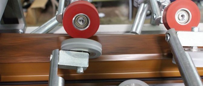 La colle elle-même est appliquée à l'intérieur du film décoratif. Au cours de ce processus, il est nécessaire de maintenir la même épaisseur - elle ne doit pas dépasser 80 microns, la plage optimale est de 50 à 75 microns. De plus, la force d'adhérence maximale est assurée avec une épaisseur minimale de la couche adhésive. Le film adhésif est littéralement pressé dans la surface du profil au moyen de rouleaux de pression spéciaux dans la machine sous pression. La température élevée à laquelle la procédure de stratification est effectuée améliore la force de liaison - pour cela, le profil et le film sont préchauffés. Le processus d'application d'un revêtement décoratif est complété par la procédure de coupe du film et de nettoyage de ses bords.