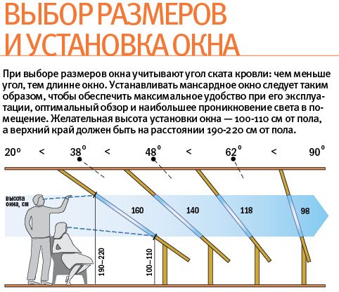 Lors de la détermination des dimensions en longueur, faites attention à l'angle d'inclinaison du toit. Plus la pente est faible, plus la longueur de la structure de la fenêtre sera élevée. Par exemple, pour un toit avec une pente de 35 °, une longueur de fenêtre de 160 cm sera optimale. Une pente de 70 ° nécessitera un cadre de 100-120 cm de longueur, respectivement.