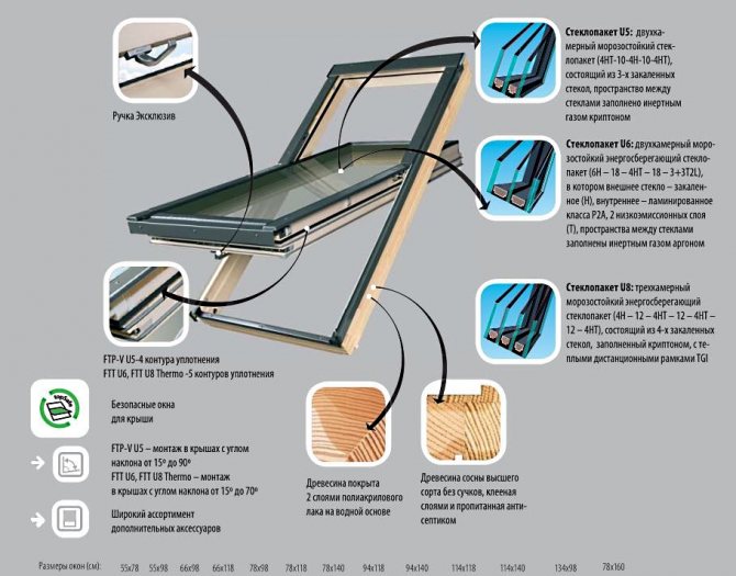 Ce sont les types de puits de lumière modernes (tailles, types). Le dispositif de modèles produits par des fabricants renommés, dans la plupart des cas, vous permet de les utiliser avec une grande commodité. Cependant, lors du choix des fenêtres pour le grenier, vous devez bien sûr faire attention non seulement à l'unité vitrée, aux caractéristiques de conception et au type de cadre. Assurez-vous également que les raccords sont de bonne qualité. Les poignées, charnières, etc. dans les lucarnes ne sont généralement pas utilisées de la même manière que dans les fenêtres de façade simples. En règle générale, la technologie de fabrication de tels raccords est le savoir-faire d'une entreprise particulière et n'est pas largement diffusée.