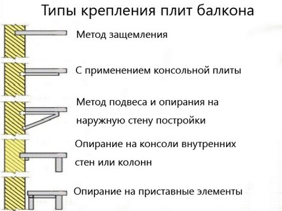 La technologie de fixation des dalles de balcon dépend du matériau à partir duquel le bâtiment est construit.