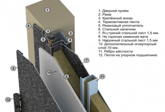 Le vantail de porte est créé selon le principe du gainage du cadre avec des feuilles de matériau réfractaire, tandis que la face extérieure d'une telle structure est réalisée avec un afflux. L'épaisseur de cette structure varie de 5 à 10 cm, et le cadre est constitué d'un profilé plein, qui est mis en forme sous l'influence des températures élevées. Pour rendre le produit plus réfractaire, tous les vides sont remplis d'un composé isolant réfractaire.