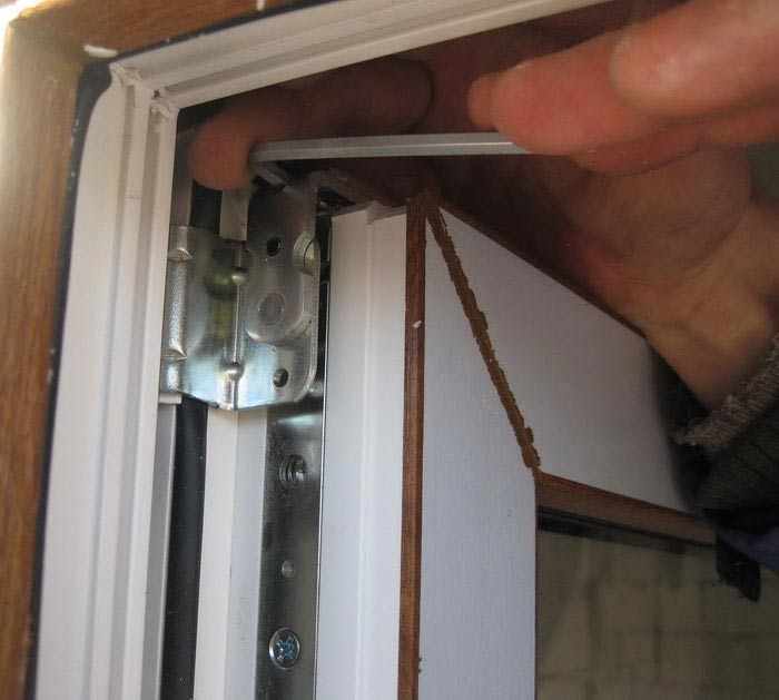Si la structure s'affaisse, les charnières supérieures doivent d'abord être réparées. Vous devez ouvrir complètement la porte du balcon, puis mettre le châssis en position de pivotement et retirer le capuchon décoratif de l'élément de fixation. Les charnières de chaque porte en métal-plastique sont recouvertes de capuchons sous lesquels se trouvent les vis.