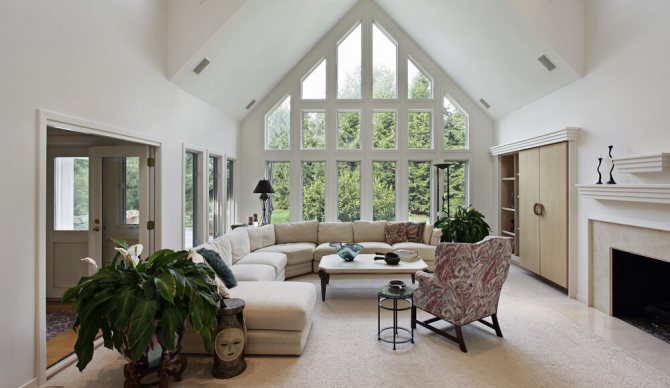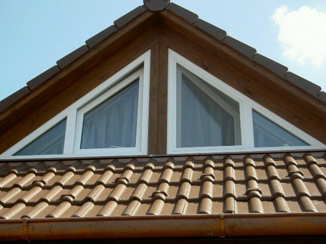 - Dessins triangulaires isocèles montés sur les combles, dans les pièces sous le faîte ou dans les greniers. Parfois, ces modèles sont complétés par des fenêtres ou des portes standard de grande taille, en les plaçant sur le dessus.