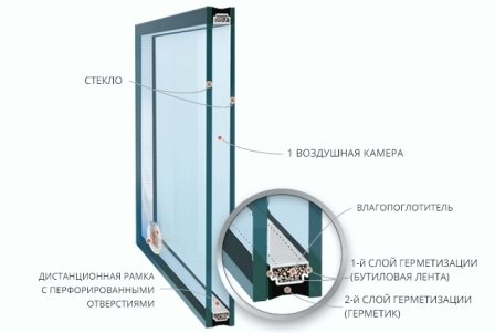 Il est facile de deviner qu'une unité à double vitrage à une chambre se compose de deux verres et d'une chambre à air. En règle générale, ses verres ont une épaisseur de 4 mm et la chambre à air a une largeur de 16 mm, mais les proportions peuvent être différentes.