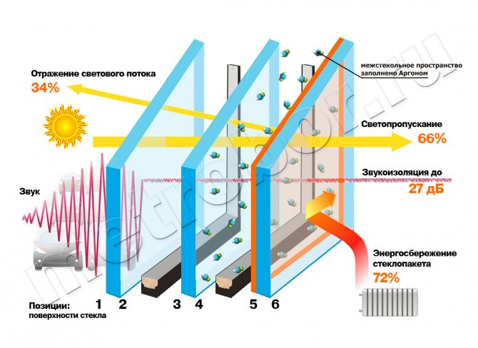 Les principales propriétés d'une unité de verre sont la perméabilité à la chaleur et l'isolation phonique dépendent en grande partie du gaz qui est pompé dans les chambres. La transmission de la lumière ne dépend pratiquement pas de cela - ici la caractéristique du verre lui-même joue le rôle principal.