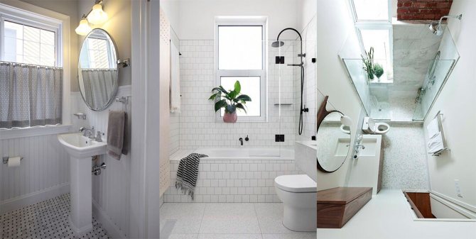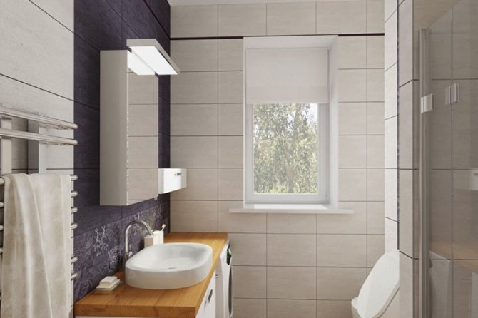 - une fenêtre en face de l'entrée - toute la plomberie peut être placée le long des murs libres en installant une baignoire d'angle ou une cabine de douche, ce qui libèrera de l'espace pour une machine à laver, des meubles, etc.