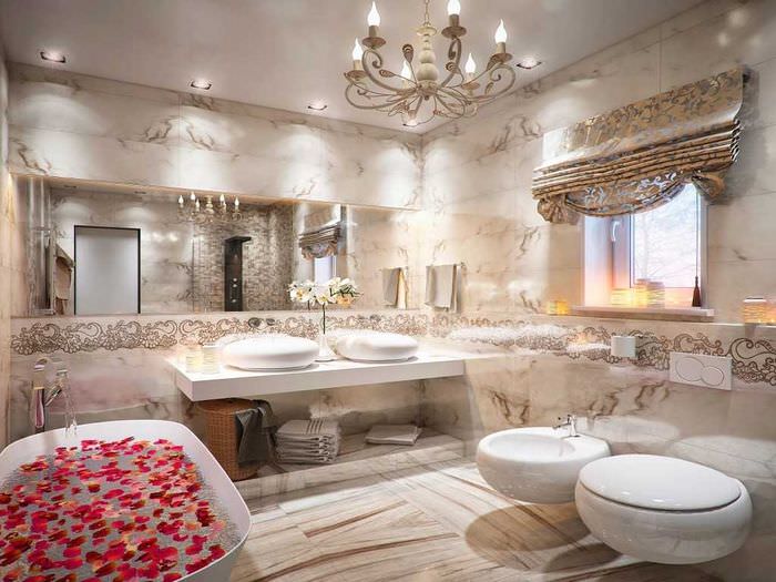 Une fausse fenêtre au plafond aura l'air suffisamment audacieuse dans l'intérieur spacieux de la salle de bain, créant ainsi l'effet de remplir la pièce de lumière provenant d'un toit transparent. Pour le créer, un plafond suspendu standard est monté, dans lequel une fausse fenêtre est équipée. En tant que cadre, cadre ou moulure, l'intérieur est collé avec du papier peint avec un motif, un carreau de miroir ou une fresque est posé.