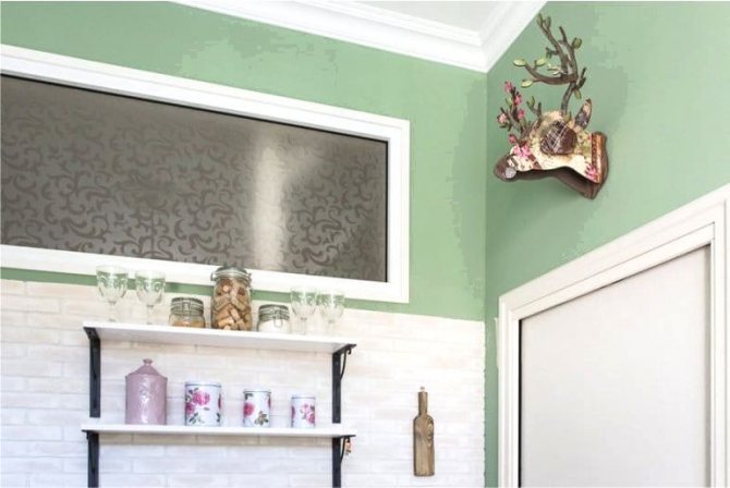 Lorsque la surface est complètement plane et bien séchée, la fenêtre entre la salle de bain et la cuisine est finie avec une couche de peinture non toxique. Pour la cuisine, il est optimal d'utiliser une peinture à base d'eau ou en dispersion de couleur claire, appliquée avec un rouleau éponge.
