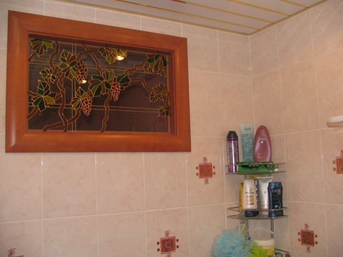 Souvent, une petite ouverture est située tout en haut du mur au-dessus de la salle de bain. Initialement, son but était d'éclairer la salle de bain pendant la journée, mais avec le temps, le composant fonctionnel a été perdu et le besoin a disparu. Une ouverture de fenêtre de ce type peut être fermée ou décorée. Dans le premier cas, il est généralement cousu avec des cloisons sèches, au-dessus desquelles des carreaux sont posés directement au plafond.