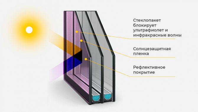 - Économie de chaleur.Le revêtement métallisé transmet les rayons visibles, mais empêche la pénétration du rayonnement infrarouge. Avec une excellente transparence à travers un tel verre, la chaleur ne quitte pas la pièce en hiver et n'entre pas dans la pièce depuis la rue en été.
