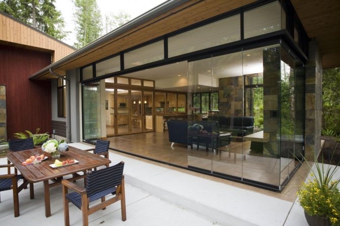 Le vitrage continu vous permet de profiter de la nature sous tous les angles. Il est utilisé pour les terrasses, les pergolas, les gazebos. Dans la plupart des bâtiments, 3 murs sur 4, le plafond est rendu transparent. Tout ce qui se trouve à l'intérieur s'ouvre à la vue des autres, il est donc recommandé d'installer du verre avec un reflet miroir.