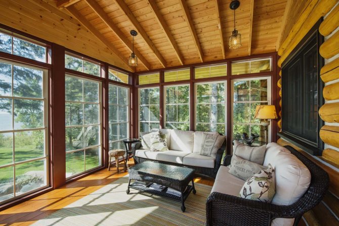 Lors du choix des fenêtres pour une terrasse, rappelez-vous que les fenêtres en bois sont les plus écologiques. Ils peuvent être réparés, restaurés, retiennent bien la chaleur à l'intérieur de la pièce et une texture unique ajoutera du naturel et du confort à l'intérieur.