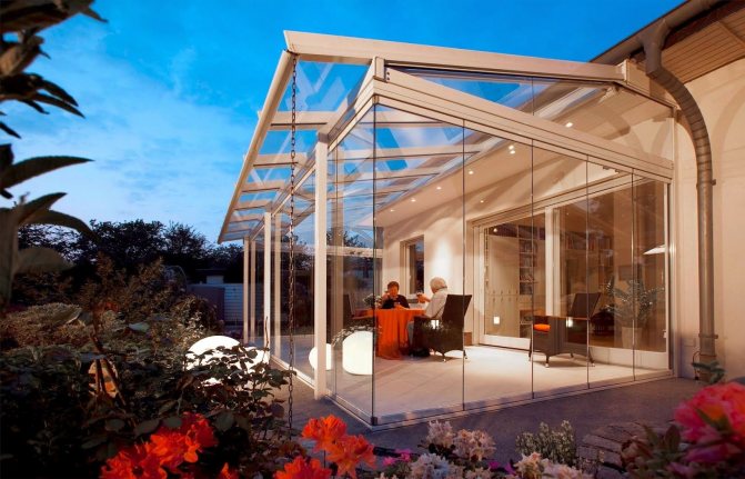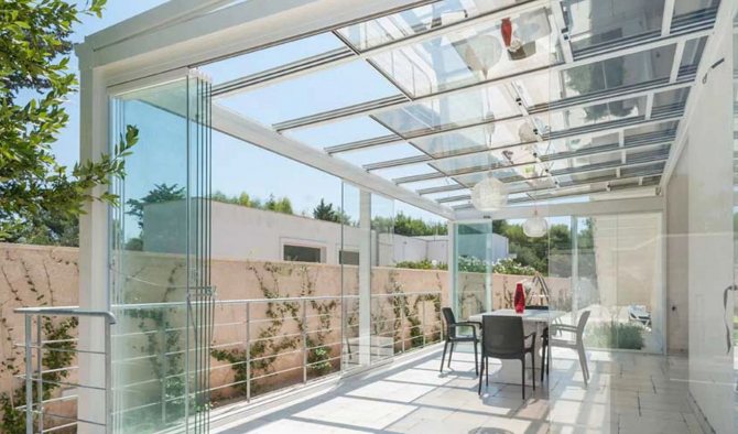 Par conséquent, une telle véranda ou terrasse deviendra une décoration du site, mais cela ne fonctionnera pas d'y rester toute l'année. Pour les bâtiments ouverts toute l'année, il vaut la peine de choisir un vitrage à ossature.