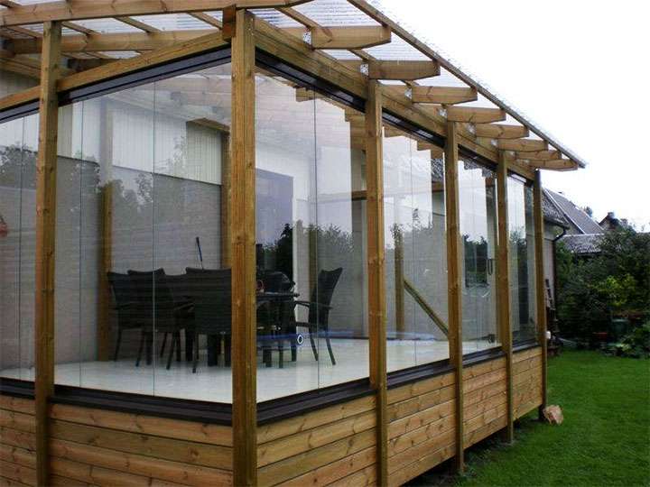 Les structures sont assemblées en verre trempé. Le vitrage est réalisé du sol de la terrasse à son plafond. Cela donne une excellente vue d'ensemble et vous permet de ventiler complètement la véranda à tout moment. Les fenêtres coulissantes, entre autres, sont bonnes car elles ne prennent pas beaucoup de place et se marient bien avec les bâtiments de toute nature. L'installation nécessite des compétences particulières et une assistance spécialisée.