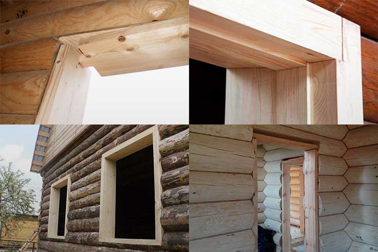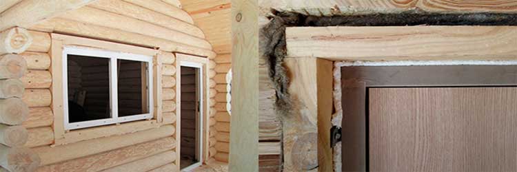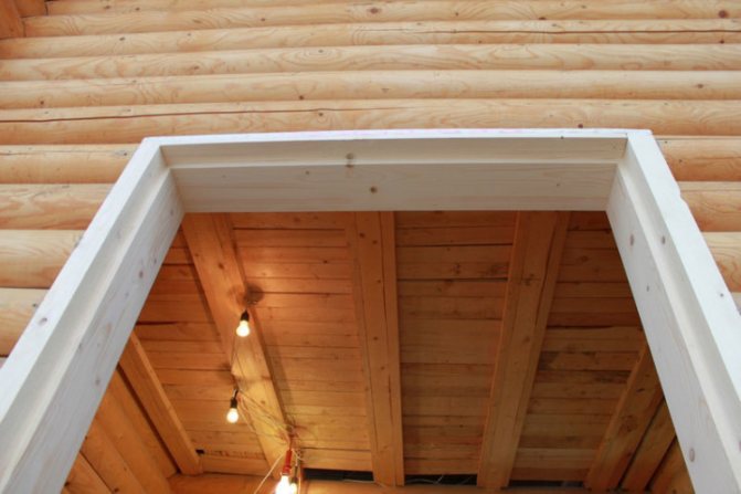 Étant donné que le montant se compose de parois latérales, d'un haut et d'un bas (ou d'un seuil), il est très important de laisser un espace plus grand entre le haut et le mur - jusqu'à 12 cm, ce qui est destiné à compenser le rétrécissement d'un bois loger. De tels espaces, bien sûr, sont traités: ils sont isolés et fermés avec des plateaux.