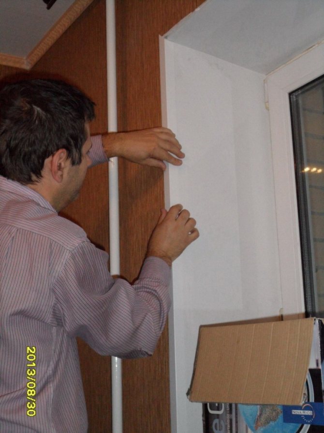 Nous installons le panneau en place. Le côté du panneau, recouvert d'un film protecteur, doit être orienté vers l'intérieur de la pièce. Avant d'installer le panneau, le film protecteur doit être légèrement retiré des bords, car une fois le panneau en place, cela peut être problématique.