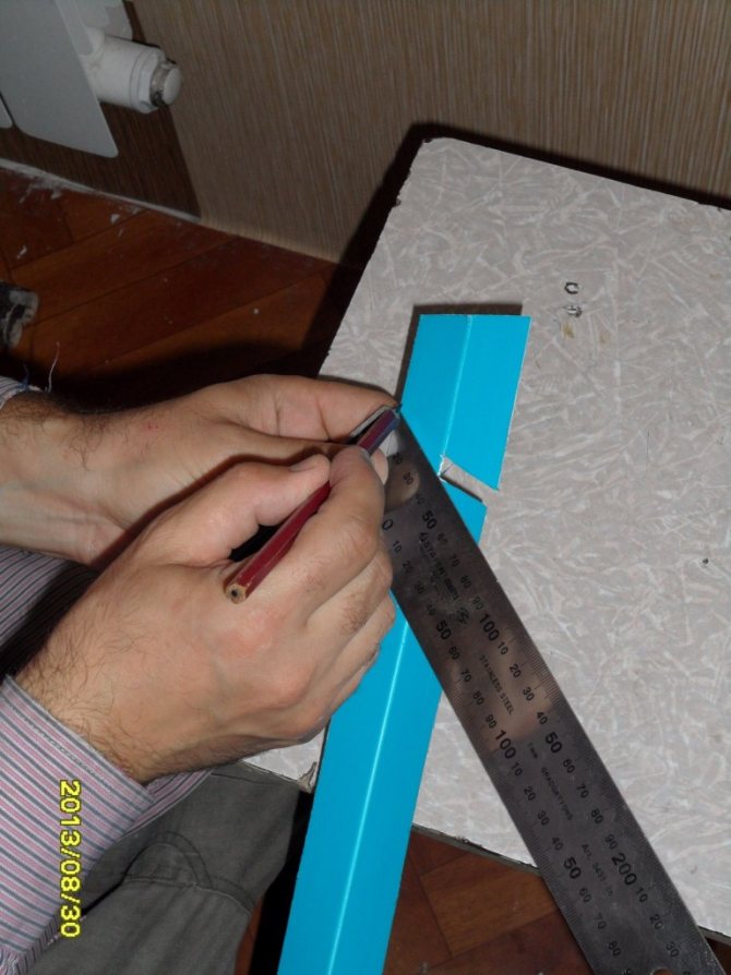 Nous coupons le coin en plastique avec un chiffon pour métal selon la marque précédemment appliquée. Cela doit être fait afin de poser le coin horizontal supérieur sur les côtés comme sur les supports.