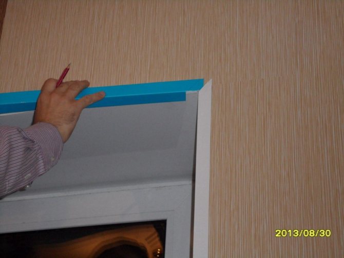 À l'aide d'un carré, nous transférons la marque du bord du bloc de fenêtre sur le coin en plastique.