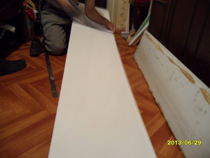 Pour faciliter l'installation de la pente supérieure, vous pouvez utiliser deux astuces délicates. Des morceaux de matériau doivent être collés sur une ligne à la fenêtre à l'aide de ruban adhésif double face. De petits morceaux de contreplaqué ou de stratifié feront l'affaire. Ces pièces collées serviront de support à la plaque de plâtre. Mais un tel support ne pourra pas empêcher complètement la feuille de cloison sèche de s'affaisser. Par conséquent, un petit morceau de feuille de contreplaqué doit être collé à la mousse au centre de la pente supérieure. Lors de l'installation de la plaque de gypse supérieure, il sera possible de l'éclairer avec des vis autotaraudeuses sur ce morceau de contreplaqué et ainsi d'éliminer complètement l'affaissement de la pente de la cloison sèche.
