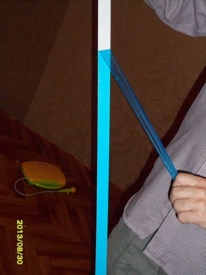 Alignez le bord non fixé du panneau selon le balisage effectué précédemment. Nous fixons le panneau au mur avec du ruban adhésif. Avant d'appliquer du ruban de masquage, je recommande de le vérifier quelque part sur un endroit discret. Dans certains cas, il peut coller fortement et ne peut être que partiellement arraché avec le papier peint. Si c'est exactement le cas, vous devez prendre du scotch d'un autre fabricant.