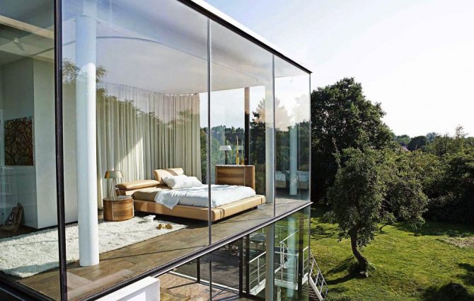 Il y a une solution à ce problème. Pour éviter l'effet d'aquarium et les regards indiscrets, vous pouvez utiliser des vitres teintées ou du verre avec un effet miroir. Ils n'interféreront pas avec la vue, mais cacheront de manière fiable votre maison aux autres.