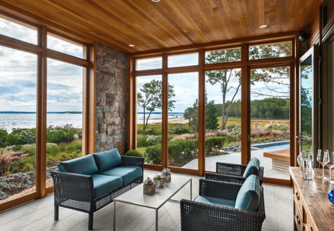 Conseils! Les fenêtres panoramiques sont idéales pour un chalet situé au bord de la mer chaude.