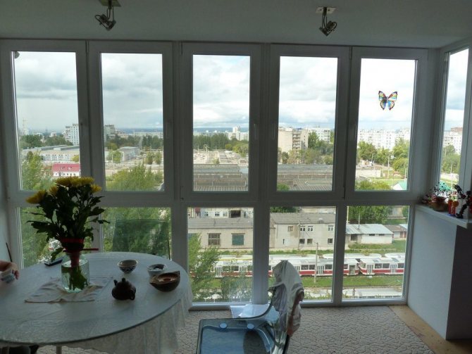 Si la loggia est de taille suffisante, une grande surface, les fenêtres panoramiques ne doivent être faites que lorsqu'elles sont orientées vers le nord. Cette solution augmentera la quantité de lumière dans la pièce, en plus, elle empêchera une chaleur extrême de se produire en été.