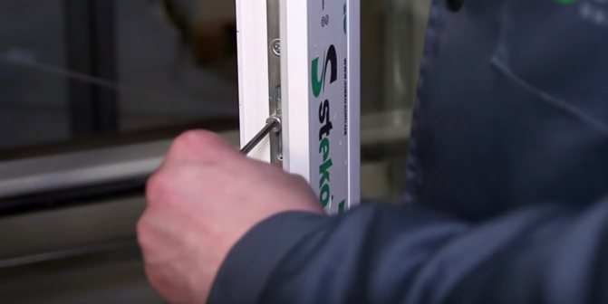 La première consiste à régler la vis située dans la charnière inférieure de l'ouvrant. En le vissant, vous pouvez obtenir un léger soulèvement de l'ouvrant. Ici, vous devez surveiller attentivement le fait que lors de la fermeture, les ciseaux ne s'accrochent pas au cadre, ainsi que l'ajustement serré du joint au profil (en particulier dans les coins). Si cette méthode ne fonctionne pas ou s'il y a un autre problème avec le bord supérieur qui s'accroche pendant le processus de réglage, vous pouvez essayer la méthode suivante.