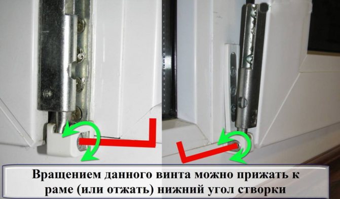 Deux autres points sont en bas de fenêtre à charnière... La procédure est la même que dans le cas du haut de la structure. Si la vis de réglage est serrée, l'ouvrant est soulevé, déplaçant la partie inférieure. Chaque tour nécessite le contrôle de la correspondance de la position de l'ouvrant par rapport au cadre. Un soulèvement excessif du cadre peut limiter la fonctionnalité de la fenêtre. Par exemple, l'ouvrant ne fonctionnera pas en mode ventilation en raison du fait que la partie supérieure s'accroche au cadre.