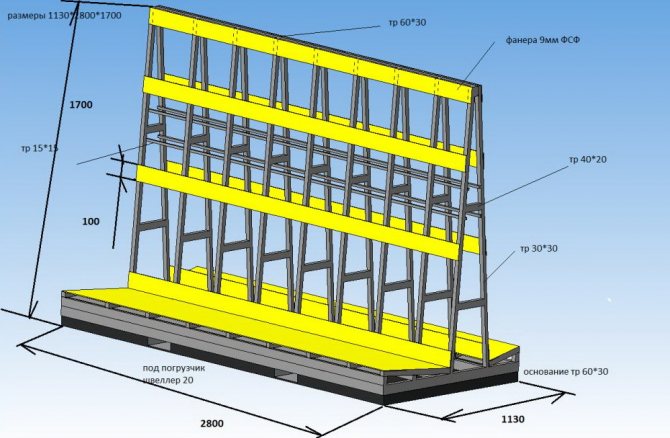 Le transport des fenêtres à double vitrage avec une pyramide est sûr et très pratique, les supports métalliques de la structure sont gainés de profilés en caoutchouc pour protéger les produits fragiles. Les fermes pyramidales sont inclinées pour faciliter le chargement et le déchargement des produits en plastique.