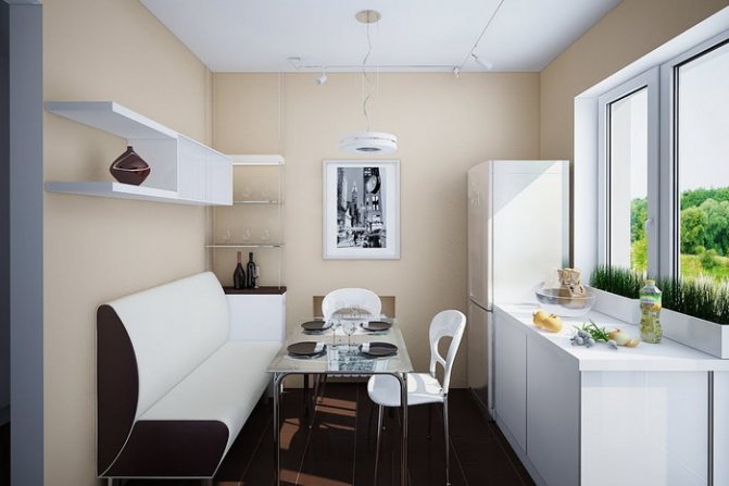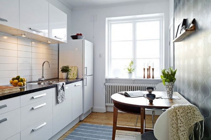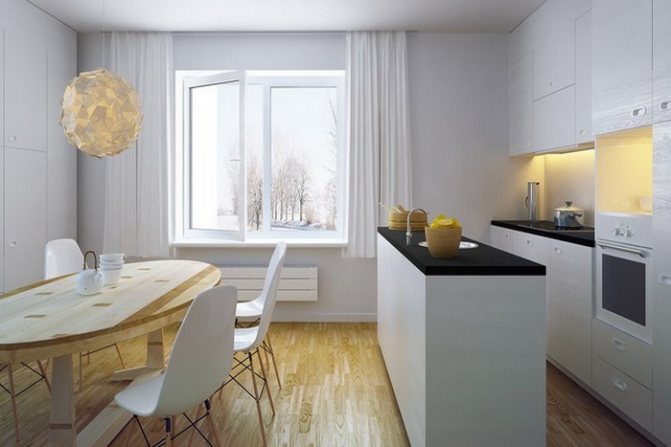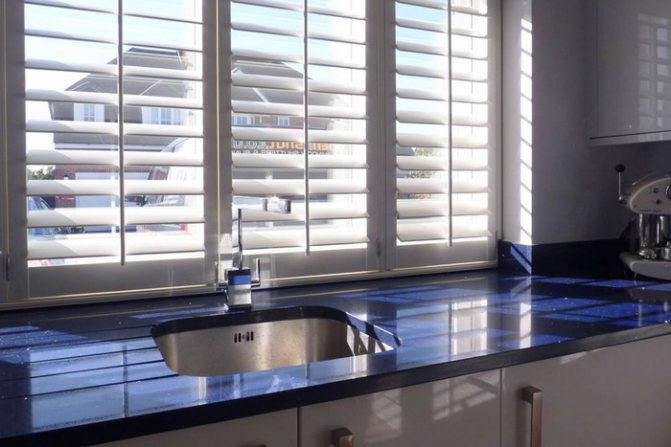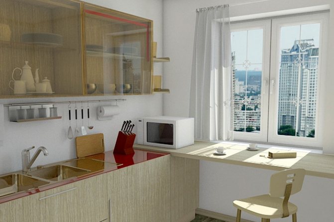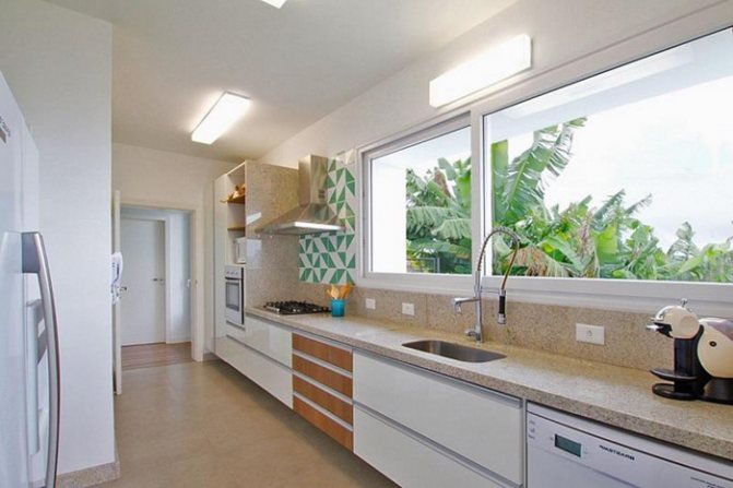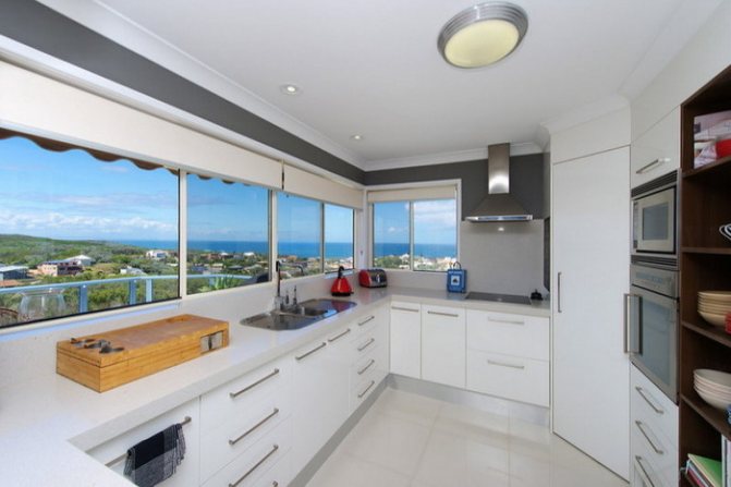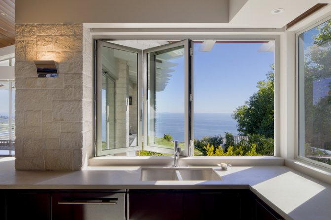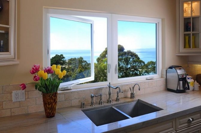 Une cuisine avec une grande fenêtre, située dans la zone où se trouve la base inférieure de l'ensemble de meubles, est le rêve de nombreuses femmes au foyer, de sorte que les designers d'intérieur offrent souvent cette option à leurs clients. Dans ces situations, la structure de la fenêtre doit être équipée de fenêtres levantes-coulissantes ou de châssis coulissants pouvant s'incliner pour la ventilation. Les mécanismes d'ouverture pivotants ne conviennent pas à de tels modèles, car ils compliqueront le fonctionnement des meubles de cuisine. Dans le cas d'une telle configuration, afin d'ouvrir le châssis, dans la zone de l'ouverture de la fenêtre, il sera nécessaire de retirer toute la vaisselle et les appareils ménagers du dessus de table, par conséquent, les experts fortement recommande de privilégier les mécanismes coulissants.