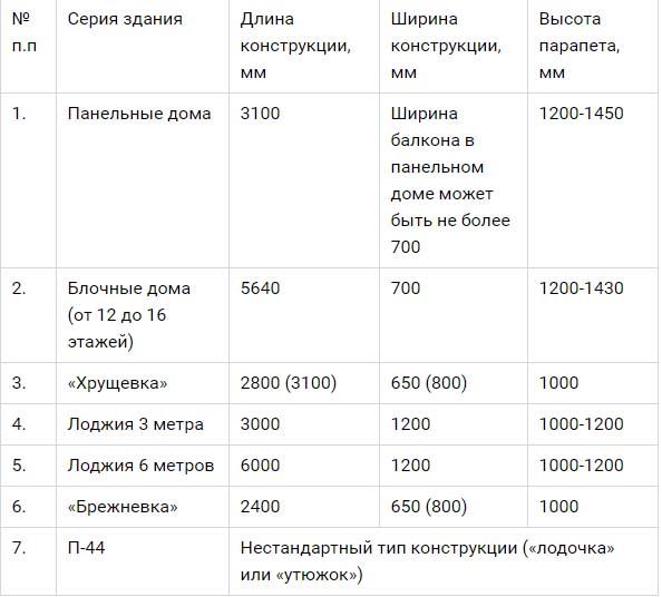 - Le balcon suédois est le type de construction le plus courant dans notre pays. Il se distingue par une saillie rectangulaire étroite au-delà de la ligne de la façade; des traverses métalliques sont prévues comme des clôtures. Les paramètres dépendent de la série de bâtiments (voir tableau).