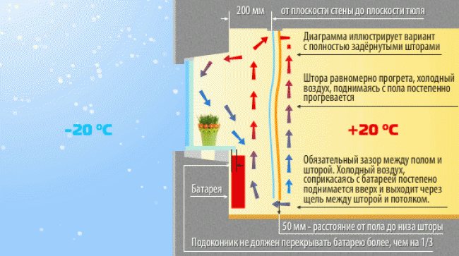 - disposer les rideaux de manière à ce qu'ils ne recouvrent pas les radiateurs (courts, lambrequins, décoratifs), ou soient à au moins 10 ... 15 cm du bord du rebord de la fenêtre. De plus, ils ne doivent pas toucher le sol et le radiateur .