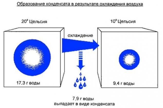 D'où vient cette humidité? Nous rappelons la physique scolaire: l'eau contenue dans l'air est dispersée uniformément dans l'espace si la température de tous les objets et surfaces est la même. S'il y a des zones plus froides, l'air qui les entoure se refroidit et la rosée tombe, c'est-à-dire la formation de condensation.