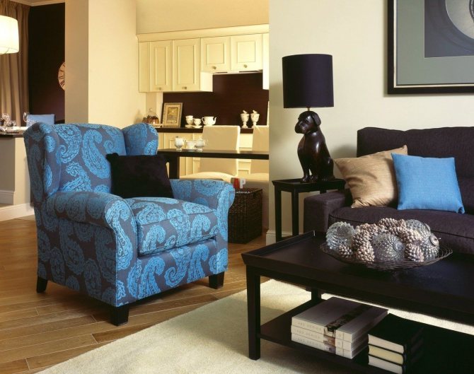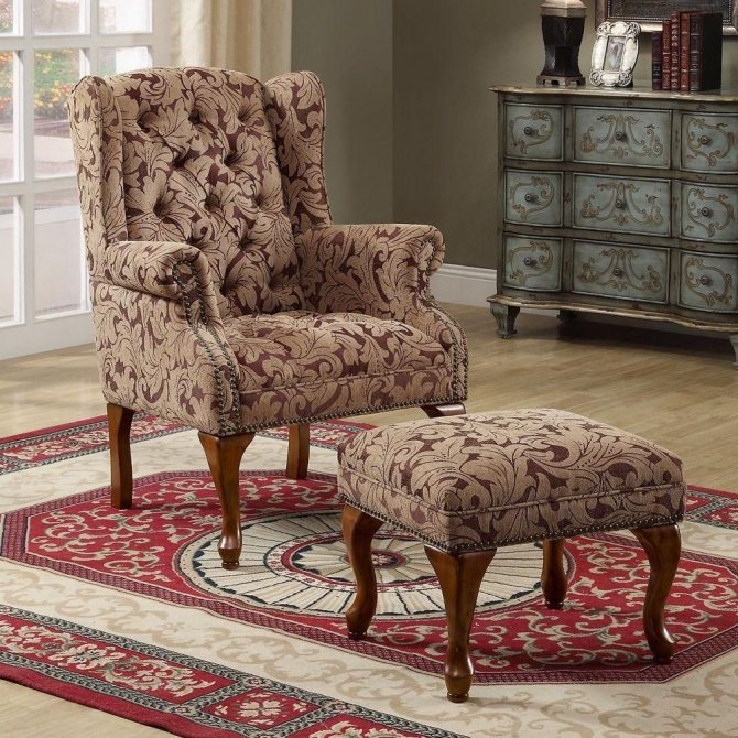 Le mobilier a des formes rondes et douces. Un pouf pour les jambes devant la chaise est approprié.