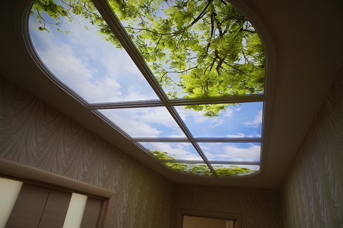 Cette technique a été utilisée ces dernières années pas moins souvent que la décoration des murs avec de fausses fenêtres. Vous pouvez placer un élément intérieur sur le plafond principal, qui doit être parfaitement plat. Mais les fausses fenêtres sont beaucoup plus belles sur les structures suspendues. Dans ce cas, vous pouvez obtenir l'effet d'un toit en verre. Bien sûr, rien ne peut remplacer l'atmosphère étonnante d'une pièce avec une telle sophistication architecturale, cependant, l'installation de fausses fenêtres crée une belle illusion. Le moyen le plus simple d'installer un tel plafond se compose de trois étapes. Tout d'abord, un plafond suspendu avec une niche est installé. Ensuite, le renfoncement est collé avec du papier peint photo représentant le ciel étoilé. Et à la fin, un cadre de fenêtre avec une reliure est assemblé et fixé au plafond.